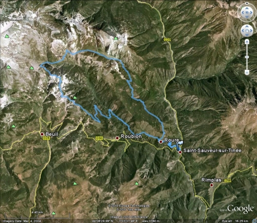 Description: start from St Sauveur sur Tinee and take the GR 52A to Roure (posts 232, 234, 235, 237, 238, 239, 240). Continue toward Chalanchas (253, 256) and go up to the Crete de Falcon (288). From there follow the crest line to the Col des Moulines (102, 104, 46) where we join the GR 5. Go to the Portes de Longon and the Refuge Longon (280, 279, 278). Go back down to Roure and St Sauveur sur Tinee via the GR 5 (277, 276, 254, 241, 240, 235).